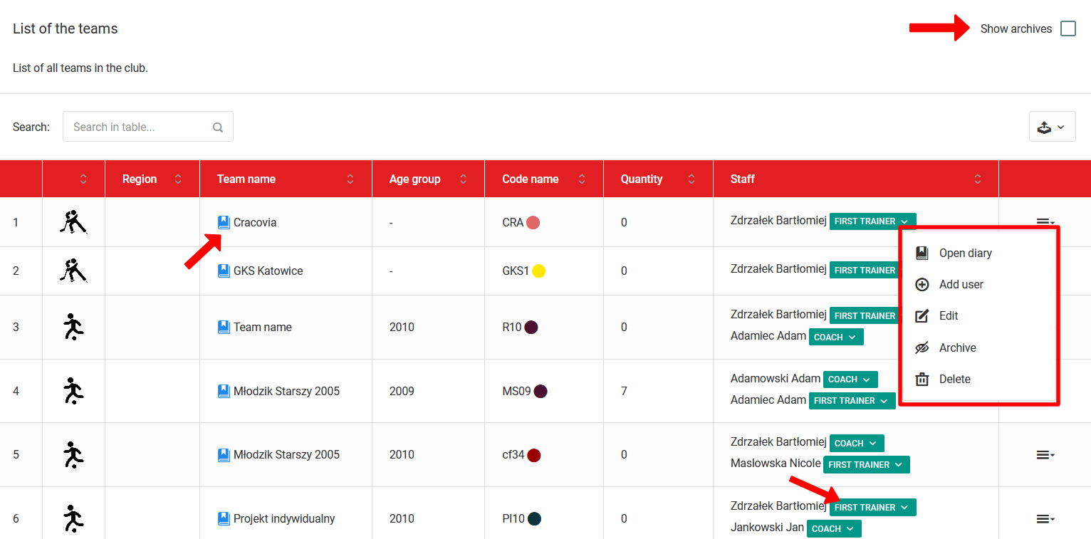 Nachdem Sie zur Teamliste gelangt sind, sehen Sie alle Teams in Ihrem Verein. Diese Registerkarte enthält viele wichtige Möglichkeiten, die für Ihren Verein entscheidend sind. Die erste Möglichkeit ist die Option, das Tagebuch jedes Teams einzusehen. Klicken Sie dazu auf das blaue Symbol neben dem Teamnamen. Nach dem Klicken auf das Symbol werden Sie zum Tagebuch des ausgewählten Teams weitergeleitet. Die zweite wichtige Option ist, einem Team einen Trainer zuzuweisen. Um einem bestimmten Tagebuch die Berechtigungen für einen Trainer hinzuzufügen, wählen Sie die Option aus dem Menü (letzte Spalte): "Benutzer hinzufügen". Dann sehen Sie ein Popup mit einer Liste der Mitarbeiter und einer Liste der Rollen, die der Mitarbeiter im Team spielen kann. Denken Sie daran, dem Trainer die volle Zugriffsberechtigung auf das Tagebuch zu geben, indem Sie ihn als Cheftrainer oder Trainer einsetzen. Andere Rollentypen sind nur lesend. Um eine Rolle im Team zu bearbeiten, klicken Sie auf das grüne Feld neben dem Namen des Mitarbeiters und wählen Sie eine neue Rolle aus der Liste aus.