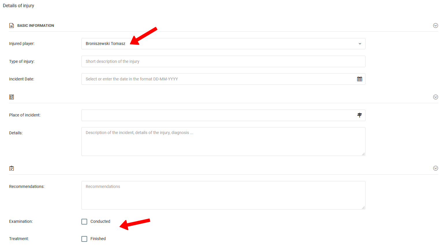 ტრავმის დასამატებლად, აირჩიეთ მარცხენა მენიუდან დღიური ტრავმები ტრავმის დამატება. შეავსეთ გამოჩენილ ფორმაში მოთხოვნილი მონაცემები, დაწყებული დაშავებული მოთამაშის სახელით. შეყვანილი ტრავმის მოდიფიცირება შესაძლებელია ნებისმიერ დროს, მაგალითად, შემოწმების თარიღის დასაყენებლად ან მკურნალობის დასასრულებლად.