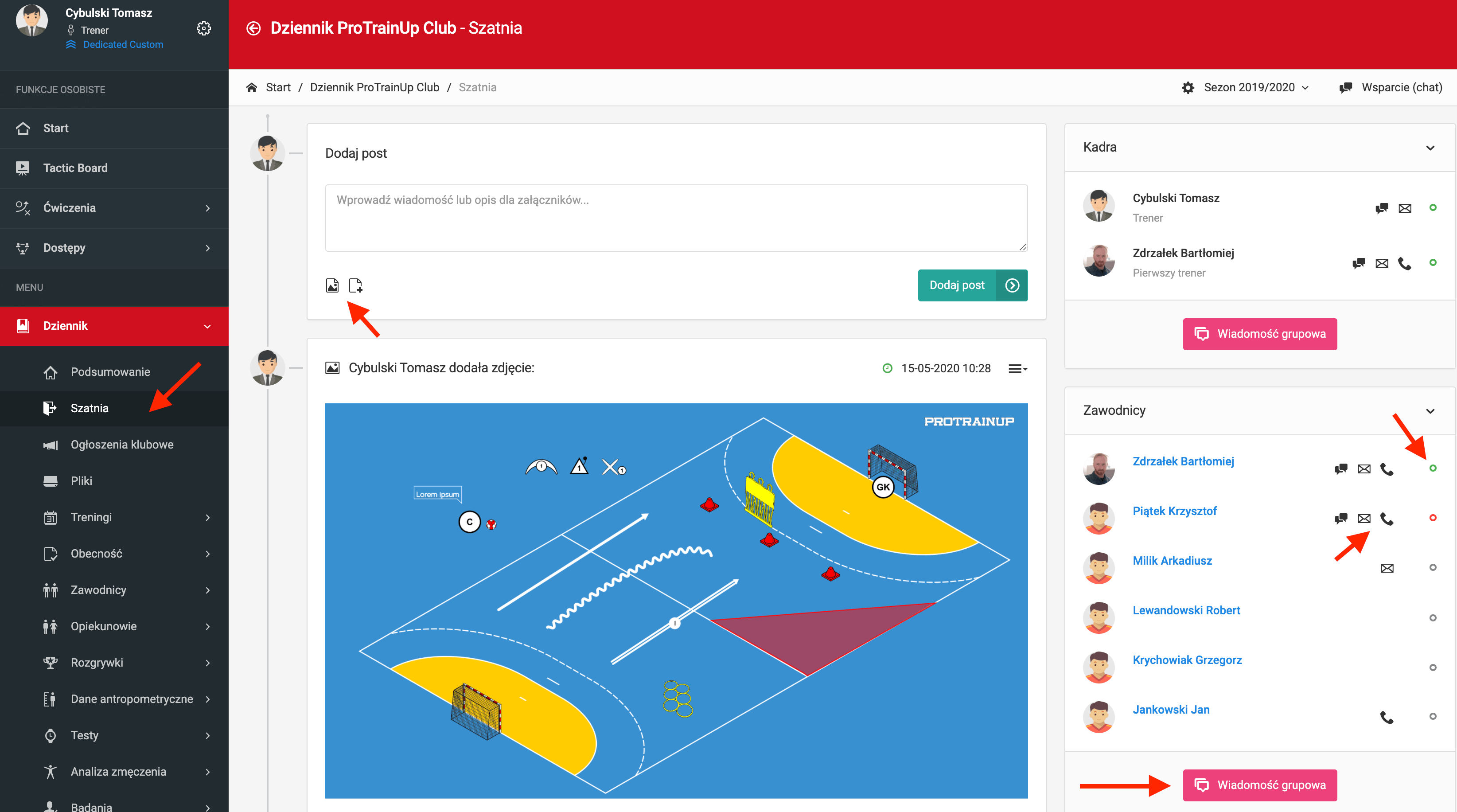 Szatnia i tablica spełniają rolę zamkniętej grupy użytkowników, w której możesz udostępniać pliki, filmy, zdjęcia czy linki. Ponadto, z tego miejsca możesz zainicjować zarówno rozmowę grupową z wybranymi użytkownikami, jak i prywatną z jednym wskazanym np. trenerem. Szatnia i tablica dostępna jest również poprzez aplikację mobilną, a każdy dodany post generuje powiadomienie push.
