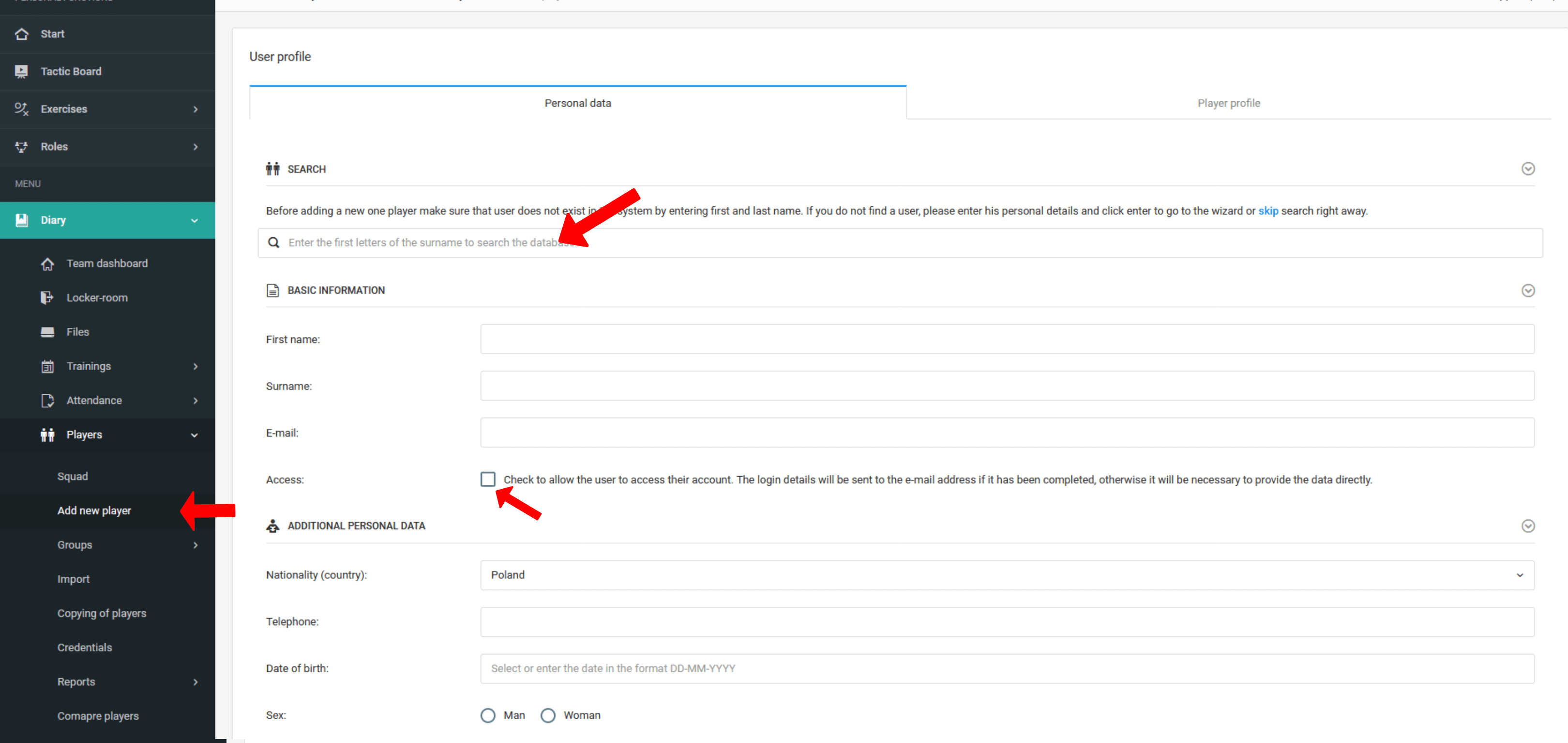 Para adicionar jogadores, selecione no menu à esquerda diário jogadores adicionar novo jogador. Na próxima etapa, você irá para o formulário de adição de novo jogador. Se um jogador já estiver no sistema, você pode procurá-lo no mecanismo de busca e assim adicioná-lo à sua equipe. No entanto, se ele ainda não estiver no sistema, crie-o fornecendo um nome, e-mail e data de nascimento. Se você quiser que o jogador tenha acesso ao sistema, dê a ele também um login e senha clicando na caixa de seleção cinza.