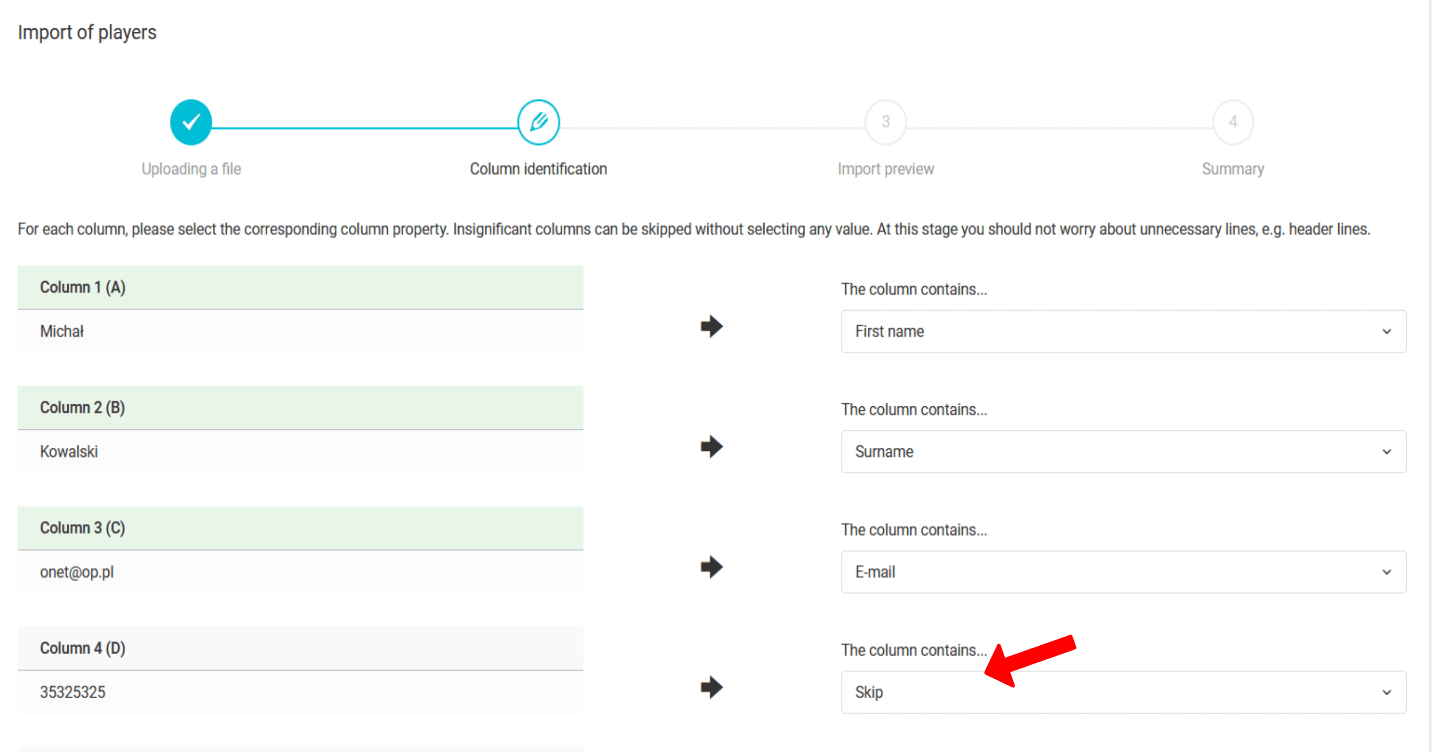 Após fazer o upload do arquivo para o sistema, você precisa passar pelo processo de identificação das colunas. Ele consiste em atribuir o tipo de dado apropriado ao elemento localizado em cada coluna. Na imagem, você já identificou as colunas com seu nome, sobrenome e endereço de e-mail. O número de telefone é usado para identificação, então você precisa selecionar a opção "telefone" na lista suspensa. Na próxima etapa, você decidirá se deseja gerar um login e senha para as contas criadas e se deseja criar contas de responsáveis.