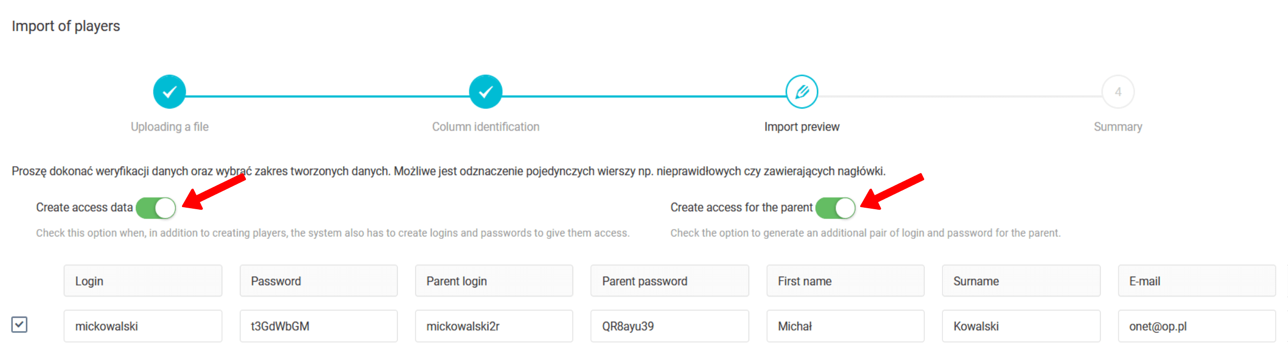 Para adicionar até cinquenta contas de jogadores e pais ao mesmo tempo, escolha importar dados do arquivo. Para acessar o importador, selecione o seguinte no menu à esquerda diário jogadores importar. Nesta janela, você pode fazer upload de um arquivo Excel com a lista de jogadores. Com base nesta lista, os logins e senhas para jogadores e pais serão gerados.