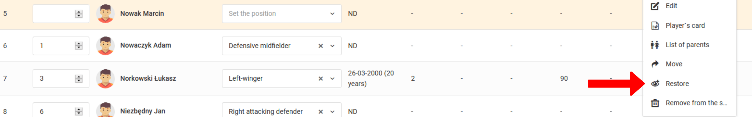 A função de ocultar é usada para esconder um jogador em listas como escalação, lista de presença, escalação de partida, etc. Jogadores ocultos não desaparecerão da lista de contribuição, por exemplo: as taxas já pagas compõem o balanço financeiro total da equipe. Naturalmente, um jogador oculto é marcado especialmente na lista de contribuição. Se houver um caso em que um jogador se mudou para outra equipe (equipe sênior) e a partir de agora ele pagará suas contribuições para a equipe sênior, ele deve ser excluído das contribuições da equipe mais jovem. Você pode descobrir como fazer isso na seção relacionada a contribuições. Lembre-se de que você pode restaurar um jogador oculto a qualquer momento. Para fazer isso, marque a caixa de seleção "mostrar ocultos" e clique na opção "restaurar" no menu do jogador selecionado.