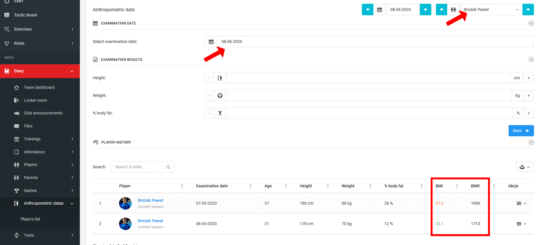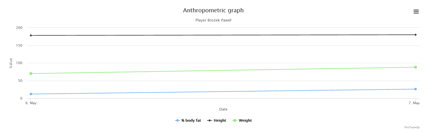 Первым шагом перед вводом данных является выбор даты измерения. Затем вам нужно заполнить три поля: рост, вес и процент жира. BMI и BMR автоматически рассчитываются на основе этих данных, пола и возраста игрока. Важным вопросом является тот факт, что эти данные следуют за игроком на протяжении всех лет ввода данных в систему и представляются в виде линейной диаграммы, благодаря которой вы можете отслеживать физическое развитие игрока за годы, в которые проводились измерения.